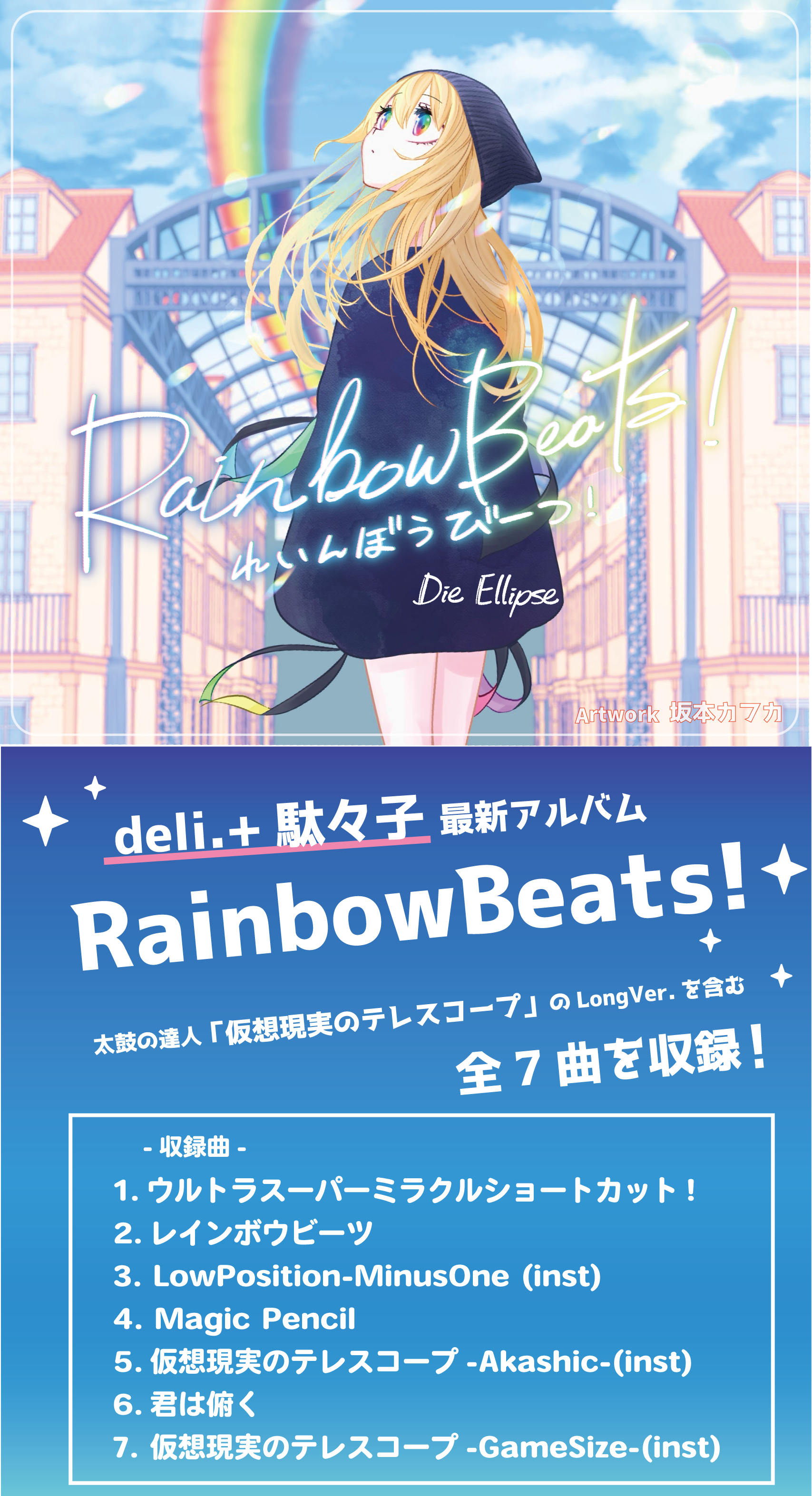 Die Ellipse 秋M3 New AlbumRainbowBeats!-れいんぼうびーつ!- ー涙は神様に任せてればいいんだ! 第一展示場 2F スペースE-16bPrice ¥1,500 ↓クロスフェードデモ↓ この動画を YouTube で視聴 ↓M2.「レインボウビーツ」先行公開MV↓ この動画を YouTube で視聴